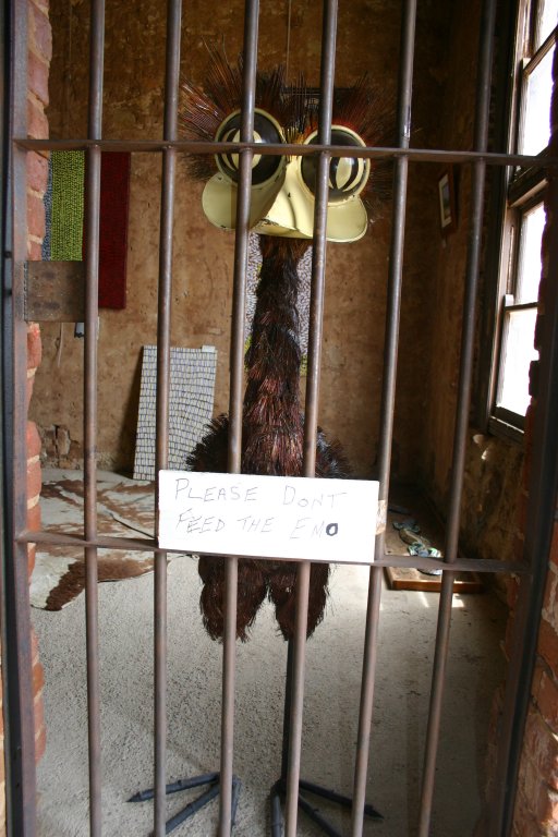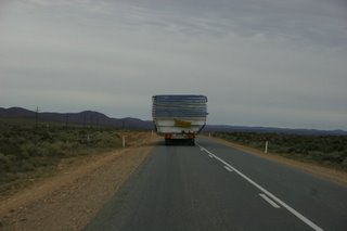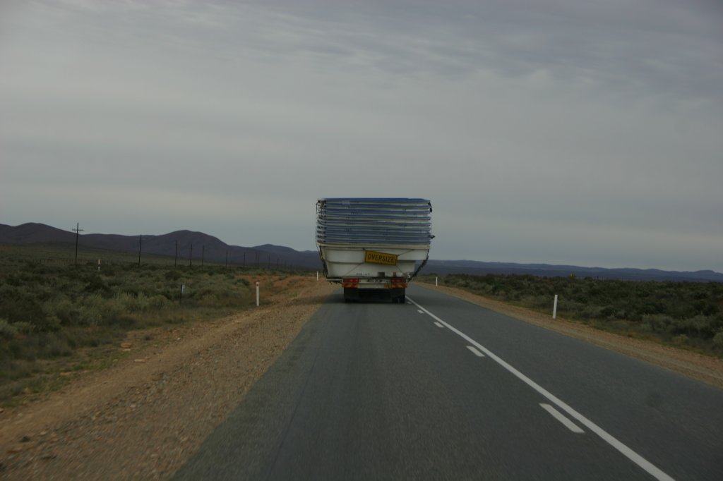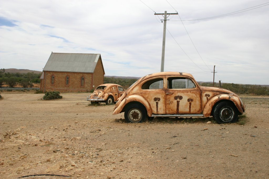 Vanuit Broken Hill zijn we eerst naar Silverton gereden. Dit is een bijna uitgestorven dorpje met een dozijn inwoners waarvan een aantal kunstenaars. Het gat is bekend omdat er wel 140 films, TV series en commercials zijn opgenomen. Zo is Mad Max 2 hier gedraaid (nooit gezien). Op de foto zie je een gebouw dat regelmatig in de film voorkwam. We hebben even 2 locale kunstenaars bezocht. De ene had wat met VW Kevers en vindt tevens dat zijn 'kunst' en humor best samen kunnen gaan (zouden meer kunstenaars moeten vinden). Na een lunch in het plaatselijke cafe zijn we vetrokken. Dit keer 265 KM. Wat is de outback toch groot. Onderweg moesten we wel een tijd achter een road train met een lading zwembaden erop blijven hangen. De lading was zo breed dat deze over de andere weghelft hing. Indien er een road train als tegeligger aankwam moesten beiden door de berm rijden, hetgeen enorme stofwolken veroorzaakte. Het ding reed ook rustig 90KM met die lading...