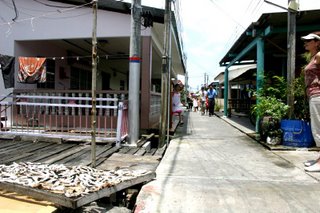 alle boten droog voor de huizen (makkelijk voor reparaties) en met vloed