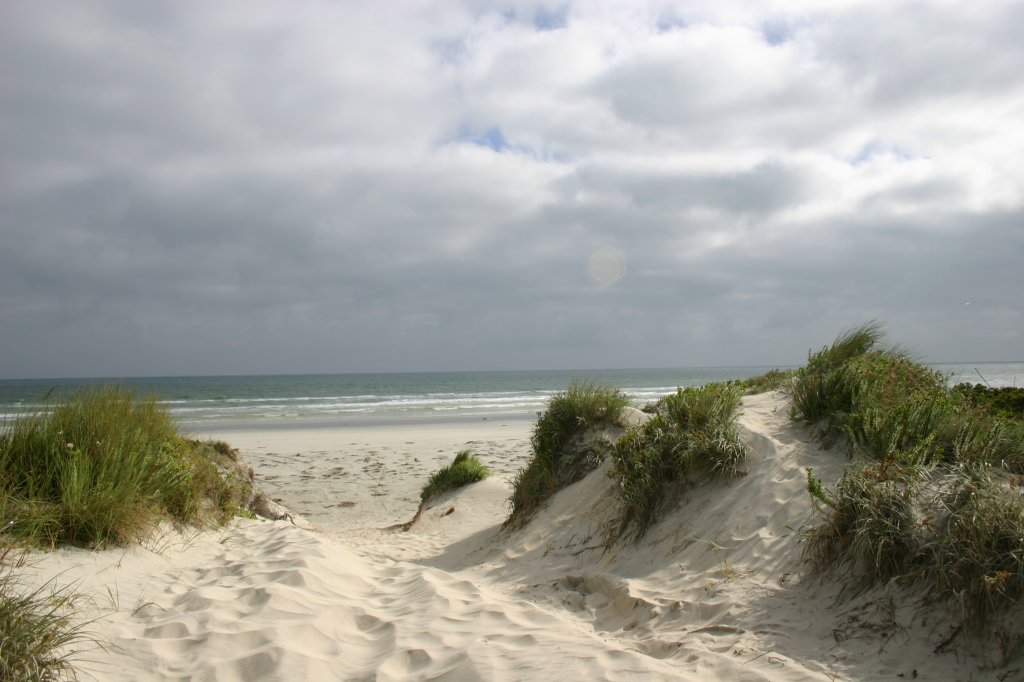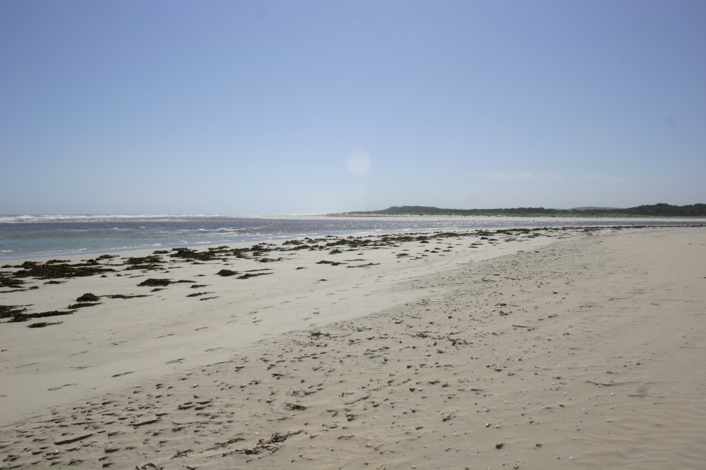 In Nelson loopt de Glenelg rivier de oceaan in. Vandaag zijn wel 8km wezen fietsen over de duinen en tegen de wind naar de monding van de rivier. Je kunt goed zien hoe het brakke water de oceaan langzaam instroomt. Op dit punt is de blauwe oceaan helemaal donkergroen/bruin. Omdat het maar een smalle rivier is (zo'n 50-75m) kun je dit effect heel goed zien.